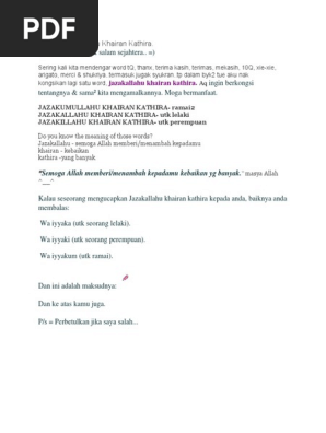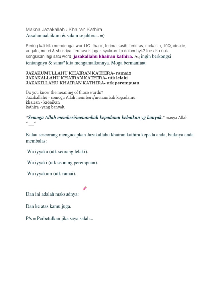Jazakallah khairan kathira meaning. Arti jazakumullah khairan katsiran. Apa arti jazakallah khairan jazakallah khairan جزاك الله خيرا terdiri dari dua kata yakni jazakallah dan khair jazakallah artinya adalah semoga allah membalasmu karena za nya panjang mestinya ditulis jazaakallah namun karena sudah umum tidak masalah ditulis latin demikian yang penting tulisan arabnya benar. Jadi setelah jazakallah atau jazakumullah perlu ada kalimat berikutnya sebagai penjelasan yakni kalimat khairan katsiran خ ي ر ا ك ث ي ر ا.